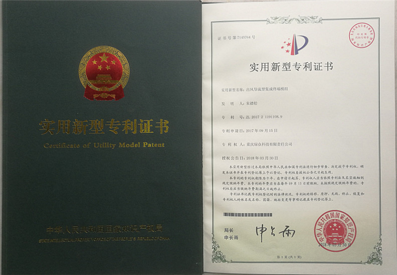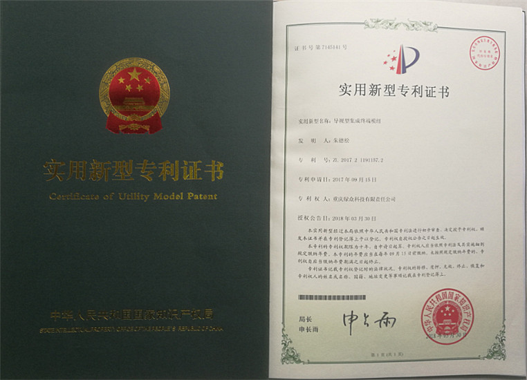 创建了“顶联”品牌及相应产品体系,创新研发的“导视型集成终端”和“出风导流型集成终端”,取得了国家知识产权局颁发的实用新型专利证书。